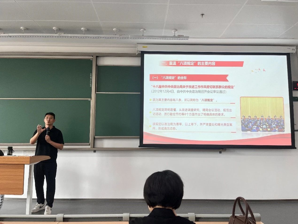 2025年4月24日上午9点,老太阳集团tcy8722网站太阳网集团tcy8722举办“锲而不舍贯彻中央八项规定精神,不断将作风建设引向深入——深入贯彻中央八项规定精神学习教育”专题党课。马克思主义学院唐扬老师应邀作专题讲授,学院党政干部、全体师生党员参加学习。
