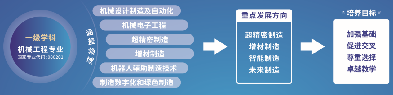 太阳网集团tcy8722现设置机械工程专业(国家专业代码:080201),涵盖机械设计制造及自动化、机械电子工程、超精密制造、增材制造、机器人辅助制造技术、制造数字化和绿色制造等领域,以“超精密制造”、“增材制造”、“智能制造”和“未来制造”为重点发展方向。