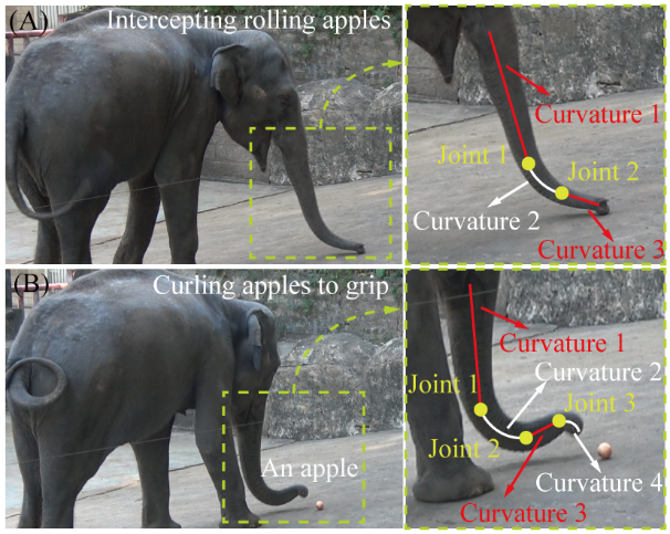 针对这一研究的局限性,大象的灵巧附器-象鼻提供了绝佳的解决方案。在自然界中,象鼻能够通过肌肉调控的方式实现局部刚化,从而形成一系列伪铰链。在这些伪铰链的作用下,象鼻被分为若干段,从而展现出不同的弯曲曲率来适应多样的操作需求。