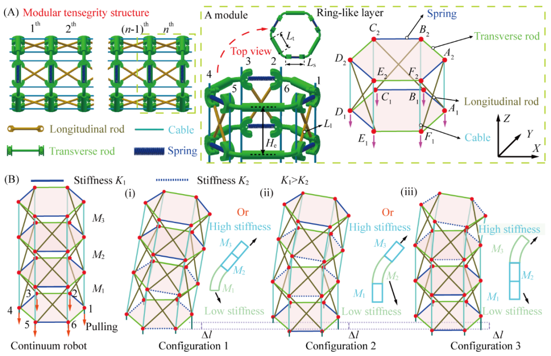 受象鼻这一生理行为的启发,本研究以张拉整体结构作为连续型机器人的机械结构,通过预编程局部弹性元件刚度的方式,调控了连续型机器人的局部刚度特性。