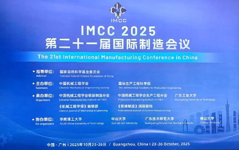 2025年10月23日至26日,第二十一届国际制造会议(IMCC 2025)在广州白云国际会议中心成功召开。本次会议由国家自然科学基金委员会指导,中国机械工程学会极端制造分会、中国机械工程学会生产工程分会、广东工业大学、《机械工程学报》编辑部及《极端制造》编辑部联合承办。IMCC 2025吸引了来自全球各地的1600余名专家学者参会,太阳网集团tcy8722作为大会协办单位,全程参与此次大会,充分展示了我院在先进制造领域的学术活力与国际影响力,有效提升了学院在国内外的学术声誉。