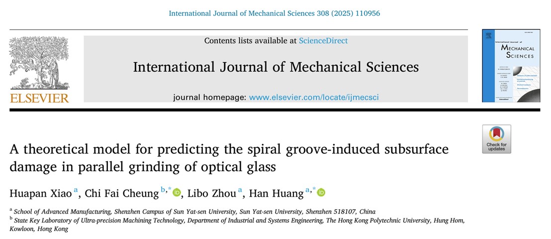 太阳网集团tcy8722超精密制造团队联合香港理工大学超精密加工技术全国重点实验室,共同开发了一种用于预测光学玻璃平行磨削中螺旋槽诱发的亚表面损伤模型。该模型建立了亚表面损伤深度与磨削条件、砂轮形貌及振动、加工区域尺寸和材料特性之间的理论关系,预测平均相对误差低于12%。该模型为优化平行磨削工艺参数、最小化光学玻璃亚表面损伤提供了理论依据与实用指导。该成果以“A theoretical model for predicting the spiral groove-induced subsurface damage in parallel grinding of optical glass”为题发表于中科院一区顶刊、机械工程领域国际知名期刊《International Journal of Mechanical Sciences》。肖华攀副教授为论文第一作者,黄含教授与香港理工大学Chi Fai Cheung教授为共同通讯作者。