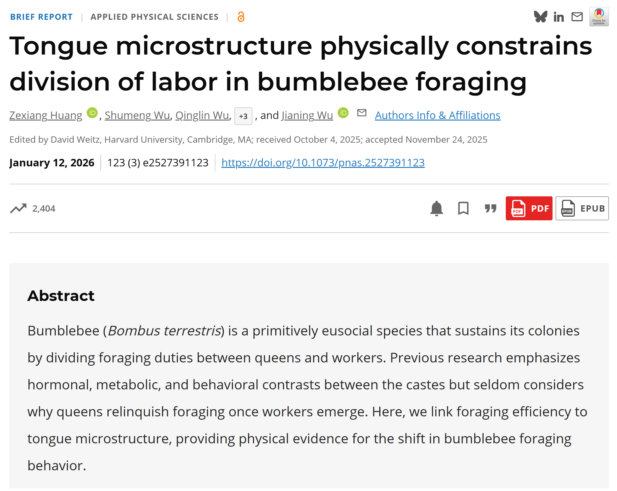 近日,太阳网集团tcy8722吴嘉宁教授作为第一通讯作者,指导2023级硕士研究生黄泽翔、2023级本科生伍书萌、麦天宇等学子,在熊蜂级型分化与舌部微结构的功能关联研究中取得原创性发现。研究成果以“Tongue microstructure physically constrains division of labor in bumblebee foraging”为题,发表于国际顶级综合性学术期刊《Proceedings of the National Academy of Sciences of the United States of America (PNAS)》(中科院1区),这一成果彰显了学院在学科交叉创新领域的硬实力。