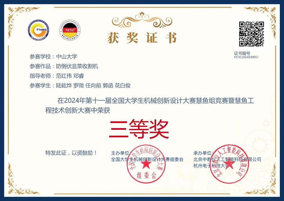 热烈祝贺我院陆鈜烨、郭函、任向前同学和所在团队,在4月举行的第十一届全国大学生机械创新设计大赛慧鱼组竞赛获得全国三等奖的佳绩!