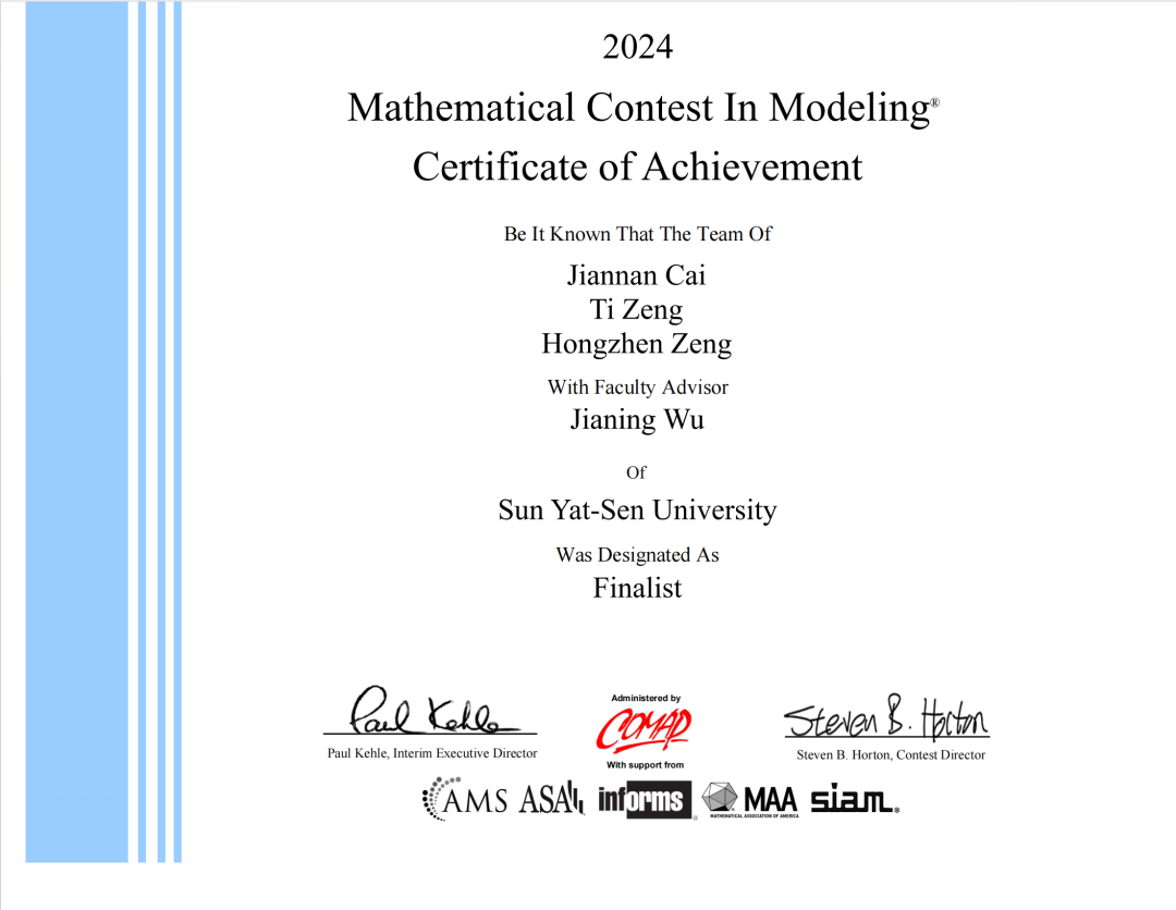 2024年美国大学生数学建模竞赛春季赛于2月2日至2月6日进行,于5月3日发布成绩。其中,我院2022级本科生蔡建南、曾泓臻、曾缇组成的团队(指导老师:吴嘉宁)在比赛中获得了Finalist的优秀成绩。