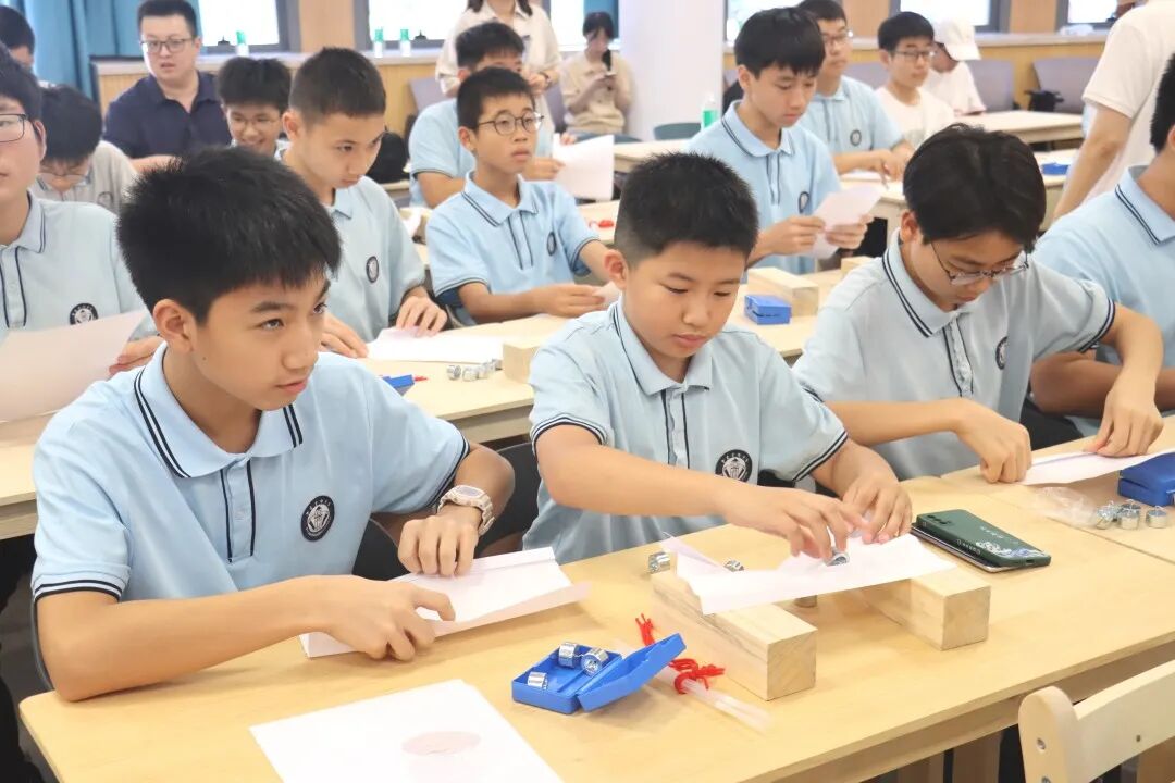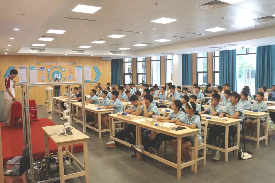 实践的最后,实践团受邀为肇庆市宣卿中学的60余名初中生举行了一场《仿生智能与自然届中的生物智慧》公开课,以“理论讲解+互动实验”相结合的方式,讲授生物、物理、机械、计算机等多学科科普知识,同学们完全沉浸在知识的海洋中,眼中闪烁着好奇与专注的光芒。