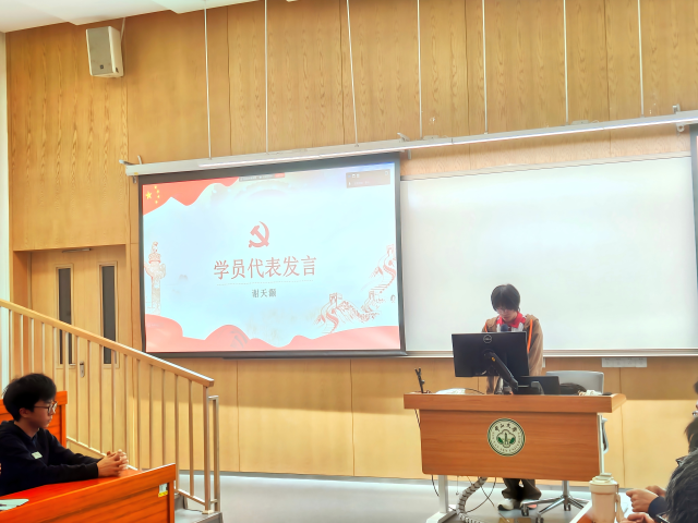 第三期优秀学员谢天灏同学分享了在青马学堂学习期间的成长与感悟。他结合自身经历,讲述了在理论学习与社会实践中的收获,表达了对学院培养的感谢,并号召全体学员继续坚定理想信念,不负韶华,不负时代,用青春和智慧为中国式现代化作出贡献。